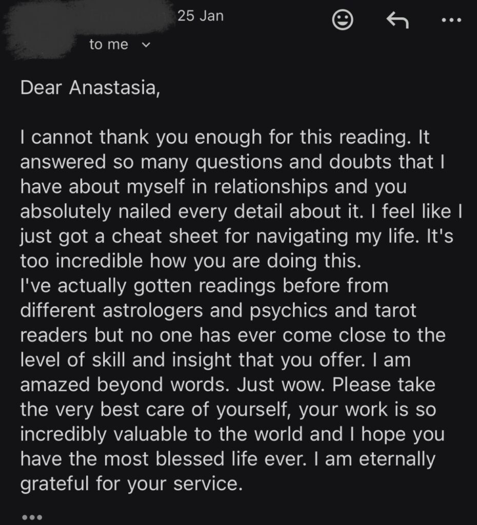 My readings are written, thoughtful, and personal. They help you recognize yourself, connect the dots, and see your gifts, your challenges, and the path life keeps quietly nudging you toward. One client recently described the experience as “getting a cheat sheet for navigating life,” and I couldn’t put it better — you end up knowing who you are, what energies you carry, what your strengths and blind spots are, and what your unique path actually asks of you.