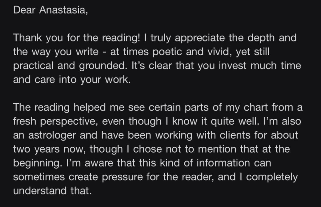 Hi, I’m Anastasia — an astrologer who works with people who want to understand themselves more deeply.